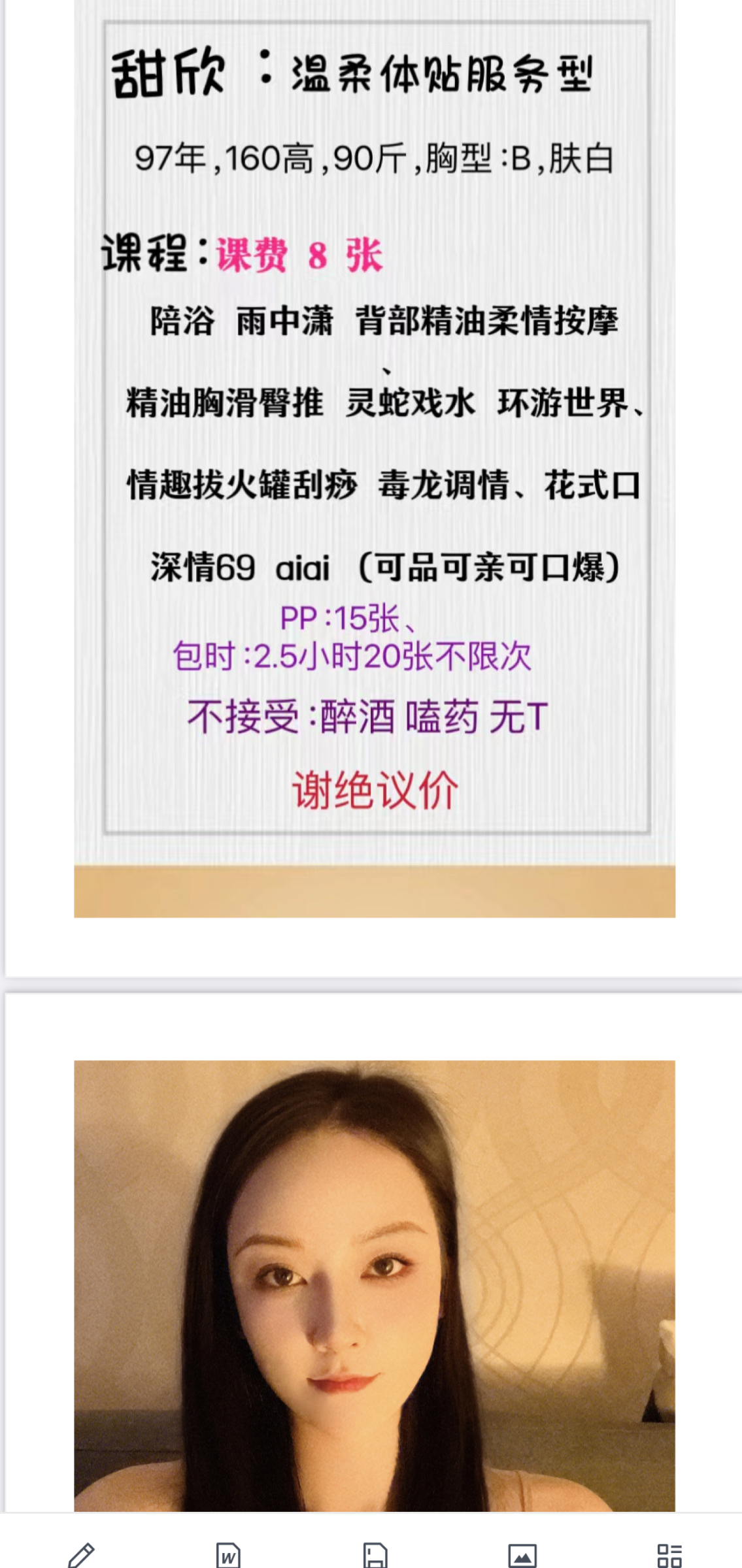 这个小姑娘在常营,晚上下班没啥事,加了挺长时间,准备过去看看,遥控上楼,大概看了一下感觉还可以,人照有点区别,不过还好,喜欢又瘦又有肉感的福利来了!培浴会突然蹲下含JJ,会用舌头舔马眼,遇上的兄弟提前扶好,遇不上就看她心情了,洗完澡她先出来的,我出来就看见她撅着屁股冲着我摇,我勒个去,摸了会逼她出水了让我躺下,开始全身舔,口活确实没得说,会舔大腿缝,感觉到了直接后入,包裹感挺好,略微紧,最关键她突然喊了一声:爸爸艹烂我,我就交枪了,有点子尴尬,兄弟们自己体验吧,这女的感觉得看她心情,完事跟我说她平时不这样,今天心情很好,,附课表
